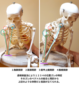 ②骨格リポジショニング法で、それぞれの関節の位置ズレを緻密に検査したその方向(ベクトル)