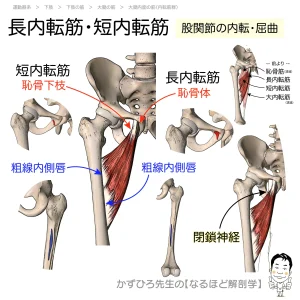 ■ 長短内転筋(骨盤前下部と大腿骨裏に長く付着する筋肉)